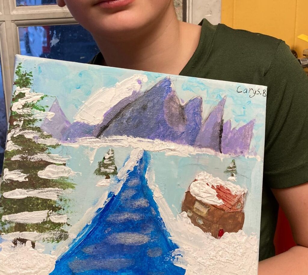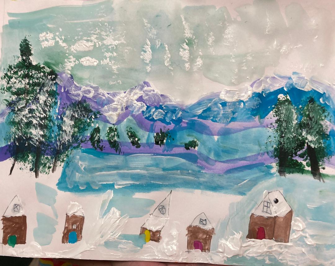 Our final piece brings a sense of community to the cold. A row of charming little houses sits nestled at the base of swirling, purple-tinted mountains. The use of repetitive shapes in the trees and rooftops gives the painting a rhythmic, whimsical quality. It’s the kind of place you’d want to spend a snowy afternoon with a hot cup of cocoa.