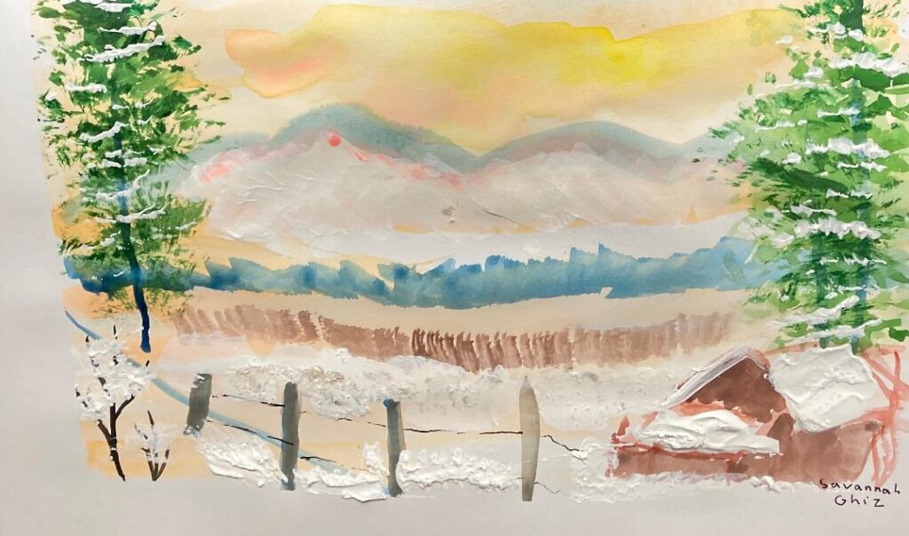 The third piece shifts the mood entirely, utilizing soft watercolors to capture a winter sunset. The warm yellows and oranges in the sky reflect beautifully off the snowy fields, proving that winter isn’t just “cold” colors. The addition of a rustic fence and a snow-covered roof gives this piece a nostalgic, “home for the holidays” feel.